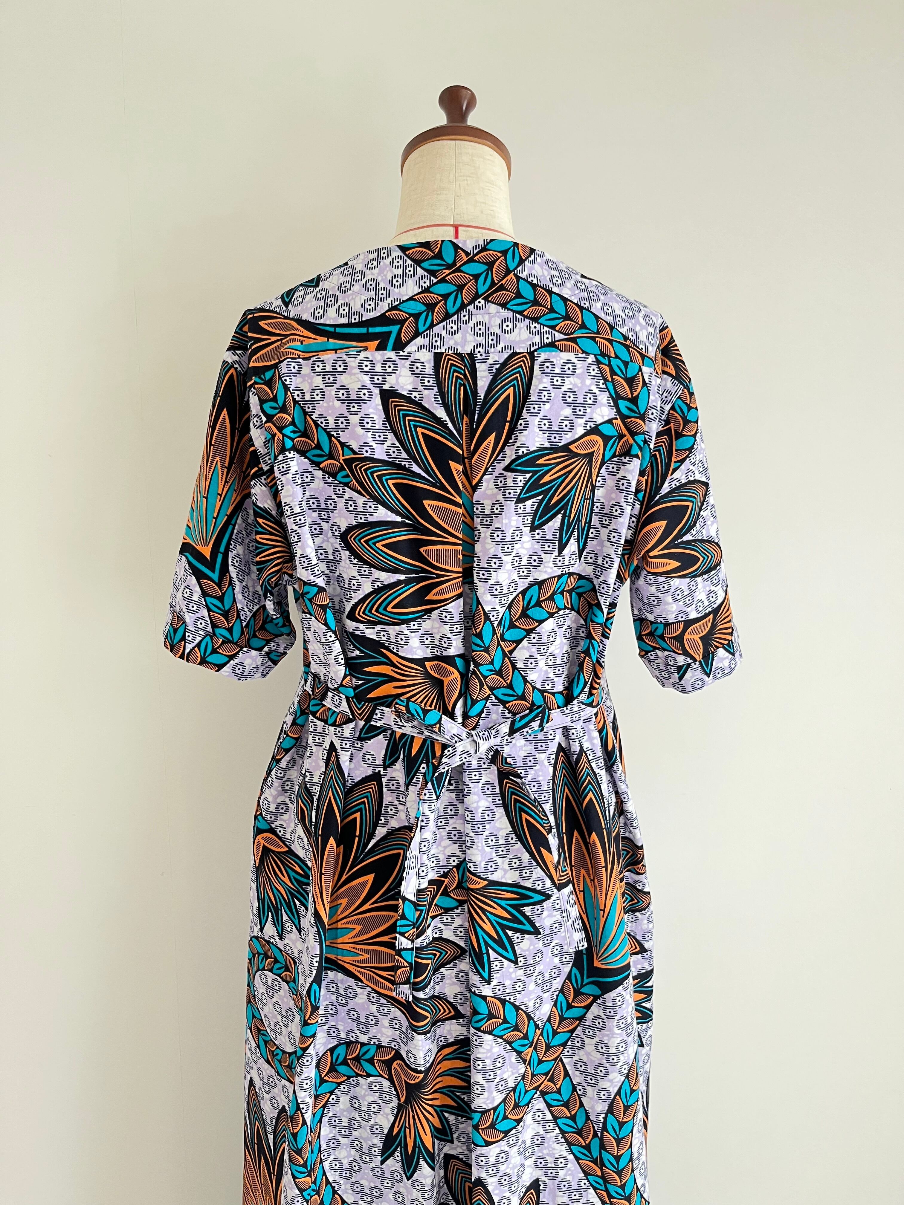 送料無料 ロングシャツドレス/半袖 アフリカ布 フリンジフラワー/薄紫地