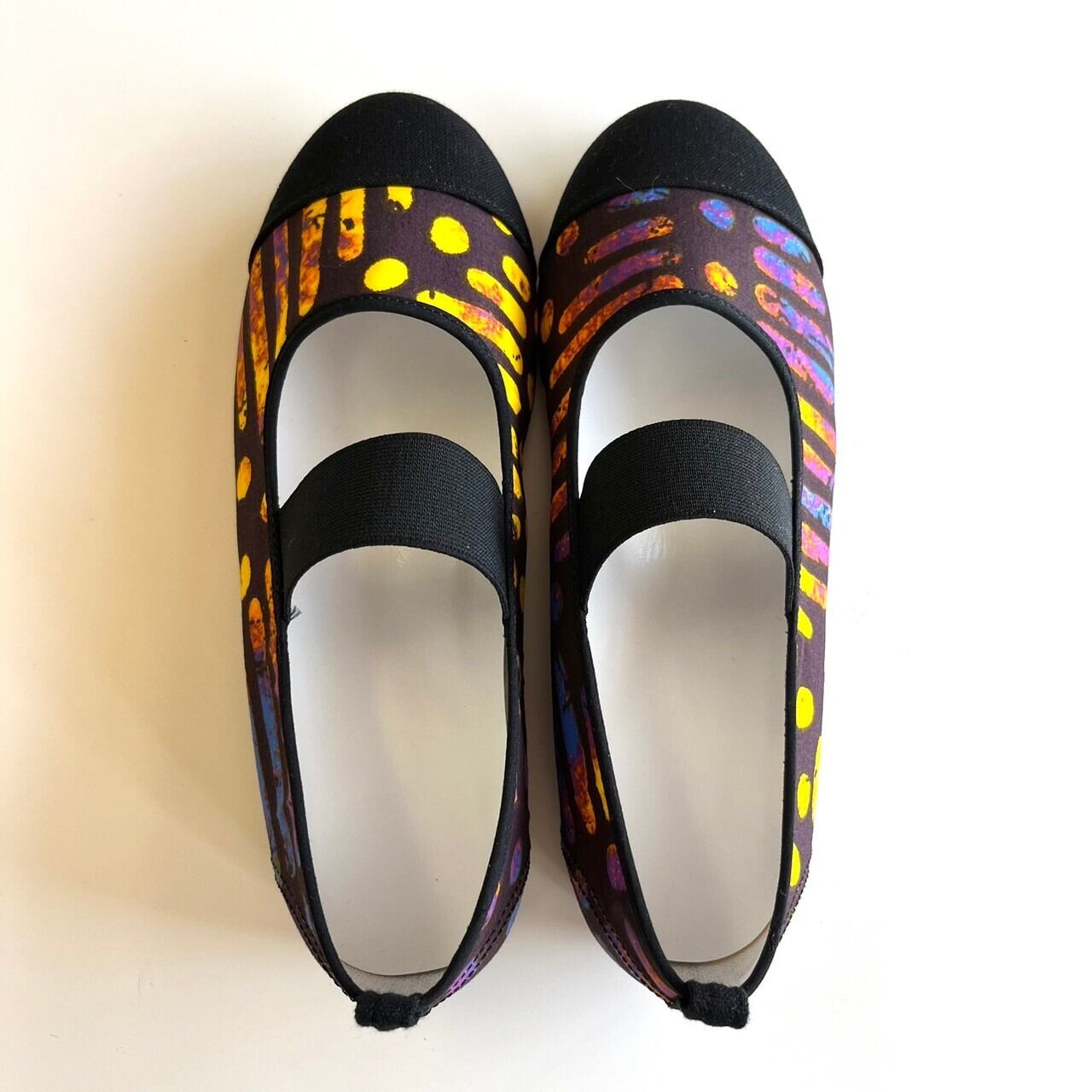 日本の文化と言っても過言ではない上履きとアフリカ布のコラボレーションで新しいスタイルのバレエシューズに仕上がりました。