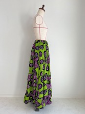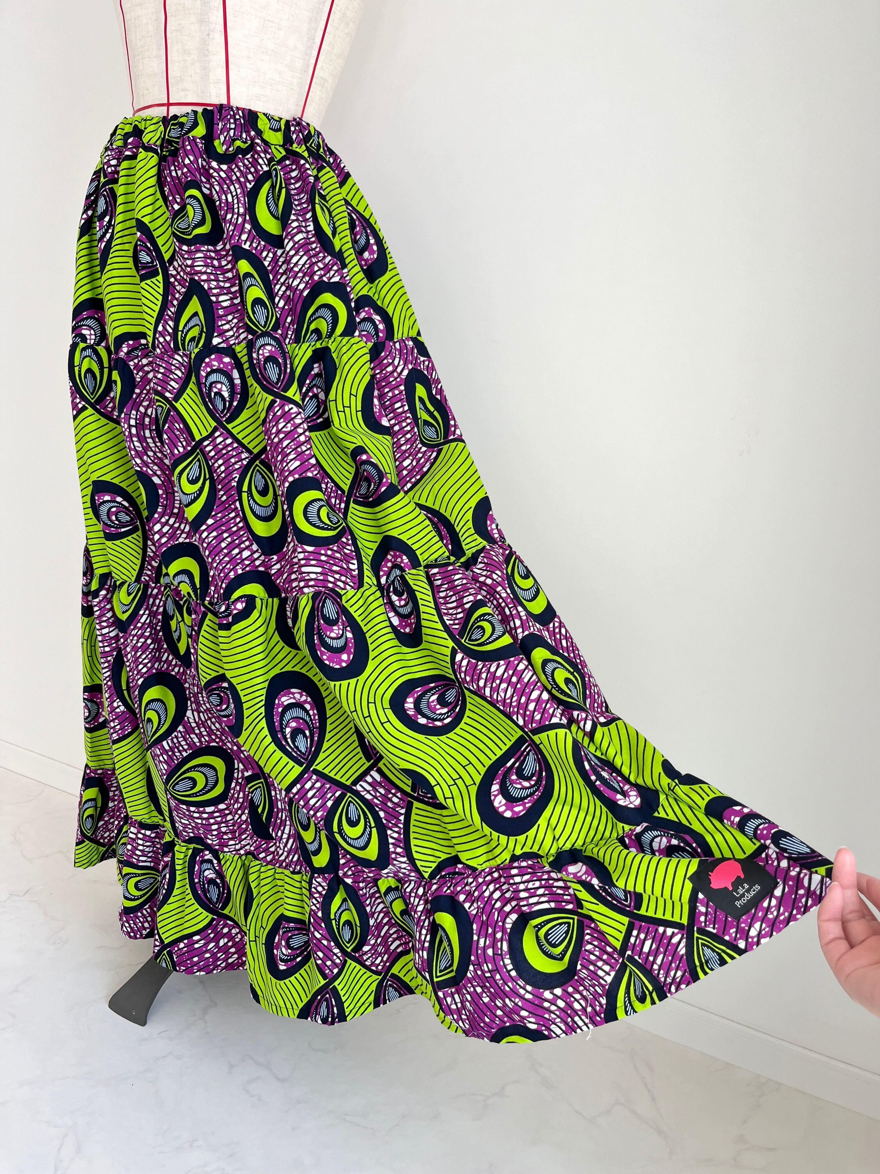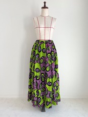 アフリカ布のティアードスカート ピーコック柄/黄緑×パープル