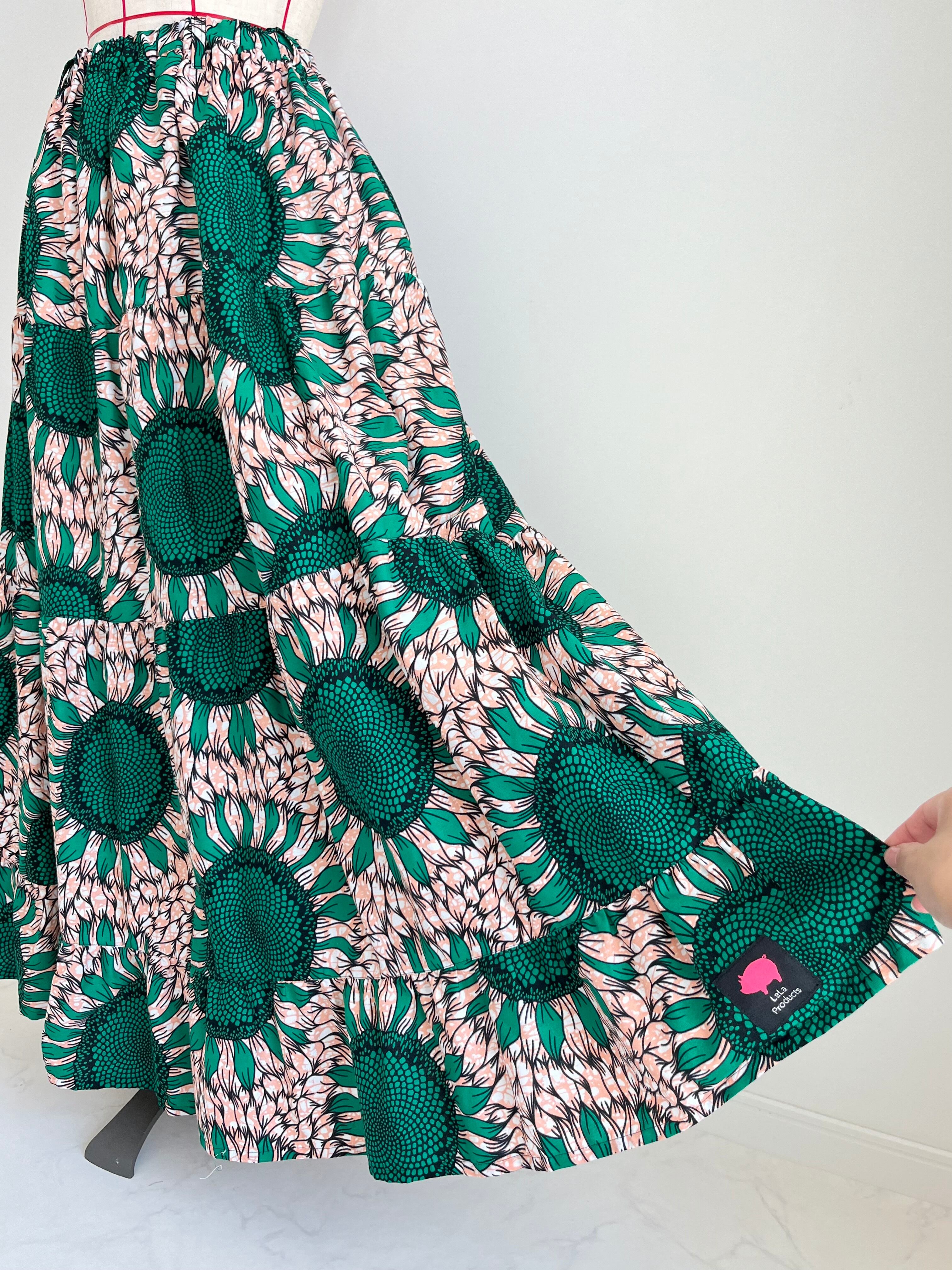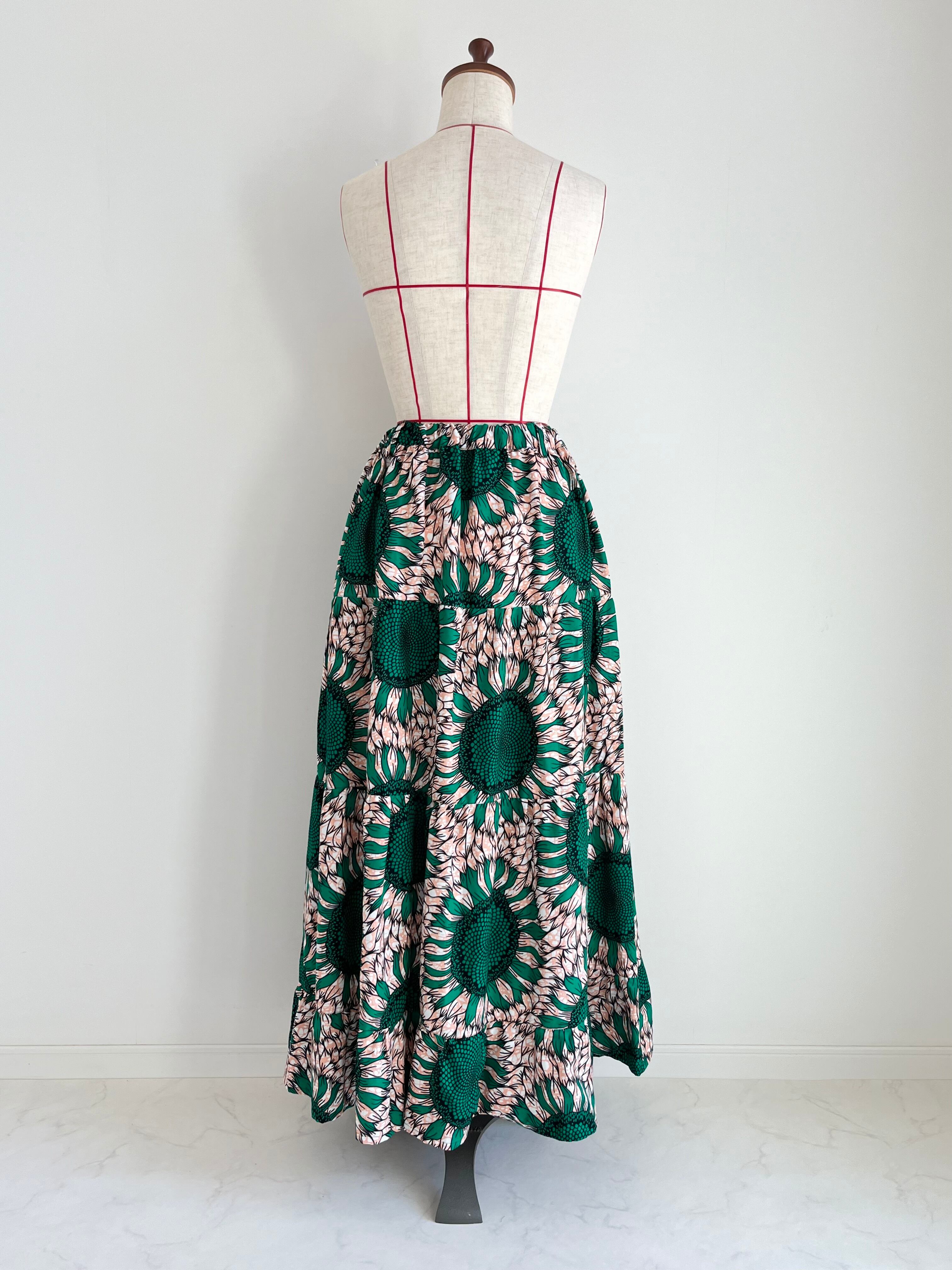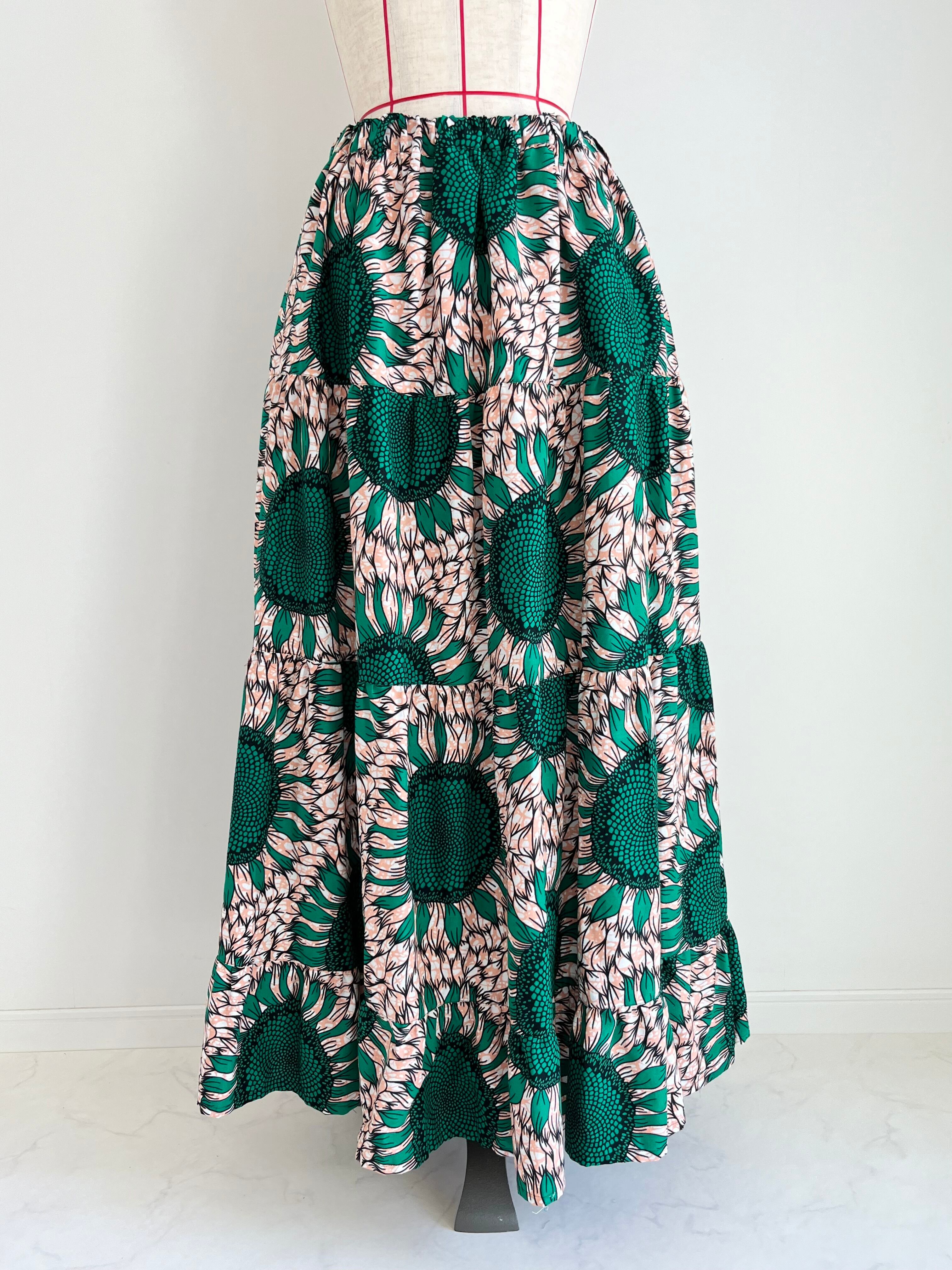 アフリカ布のティアードスカート ひまわり柄/薄ピンク×グリーン